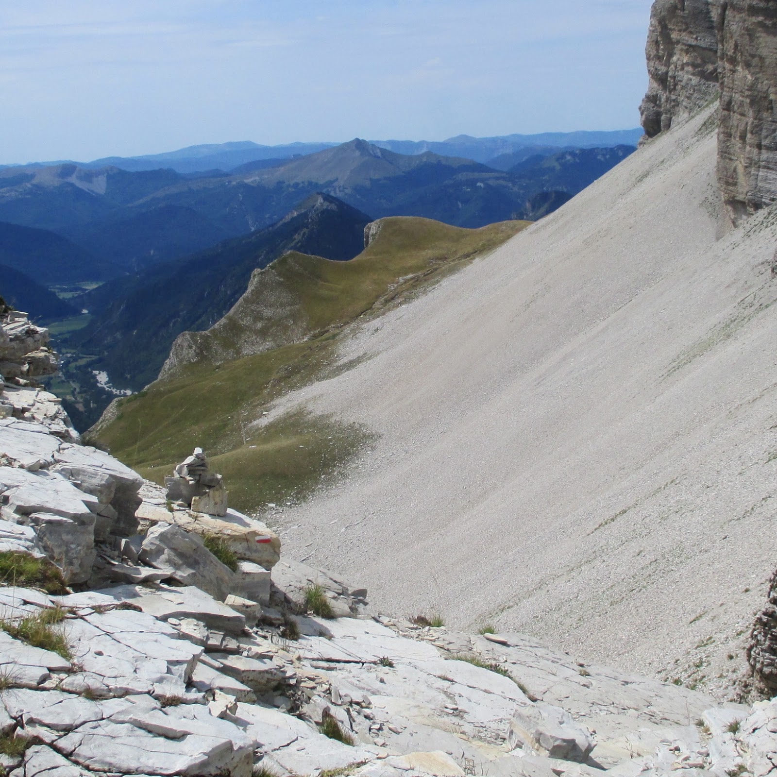 Mes randonneurs du parking sont là aussi, nous parlons un peu de nos itinéraires respectifs puis je descends vers le Col de Festre. Au bout d'un moment, j'entends de grands cris, ce sont mes anges gardiens qui me font de grands gestes : je me suis trompée de chemin et je pars sur le flanc est au lieu de descendre... Je parie que ces deux-là n'ont pas parié un kopeck sur la possibilité que je boucle mon circuit !!