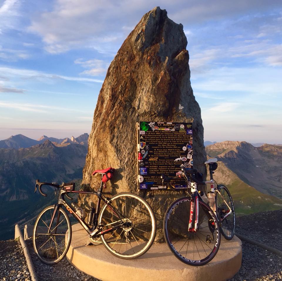 J'ai toujours adoré rouler de nuit, le silence, la profondeur, la pente semble moins raide au toucher. Les kilomètres défilent, nous éteignons vite nos lampes, il fait si clair sous la demi-lune ! Le ciel s'éclaircit, premières lueurs, nuages moutonnants, le soleil colore les sommets. Dernier effort dans la cime de la Bonette, 2800m, le panorama est à couper le souffle. Il est bientôt 7h.